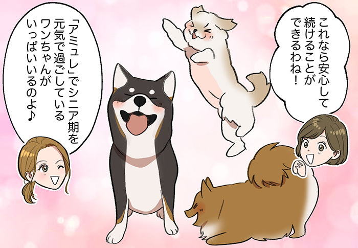 散歩もドッグランも大好きだった愛犬がいつしか寝ている時間が増えました。年齢的にも仕方ないのかなと思いましたが、愛犬はまだ思いっきり走りたいのではないかと思い、アミュレにたどり着きました。若い頃のようには行きませんが寝てばかりいたあの子がアミュレで栄養補給できてイキイキしているのは感動しました!
